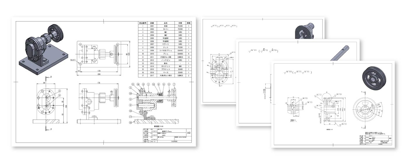 作成課題の『歯車ポンプ』は、多くの製図教科書にも掲載されており、さまざまな機械要素が含まれている題材です。この歯車ポンプを使用し、下記内容をお伝えしています。