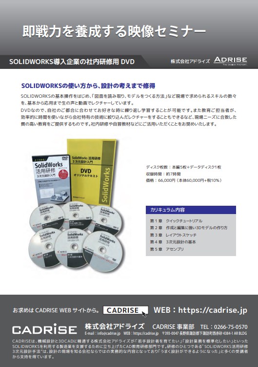 弊社の研修は、設計デザイン会社ならではの現場に即した実務的な内容となっており「うまく設計ができるようになった」と多くの受講者様から支持を得ています。そんな「実務レベルで3次元設計を習得できる研修」をDVDに収めました。