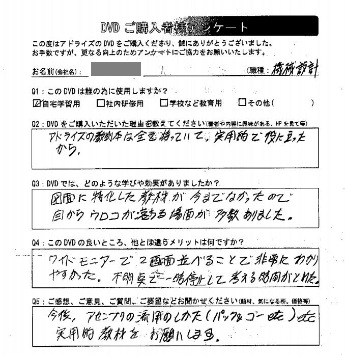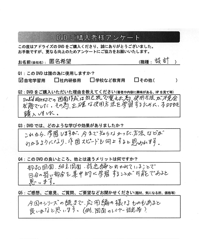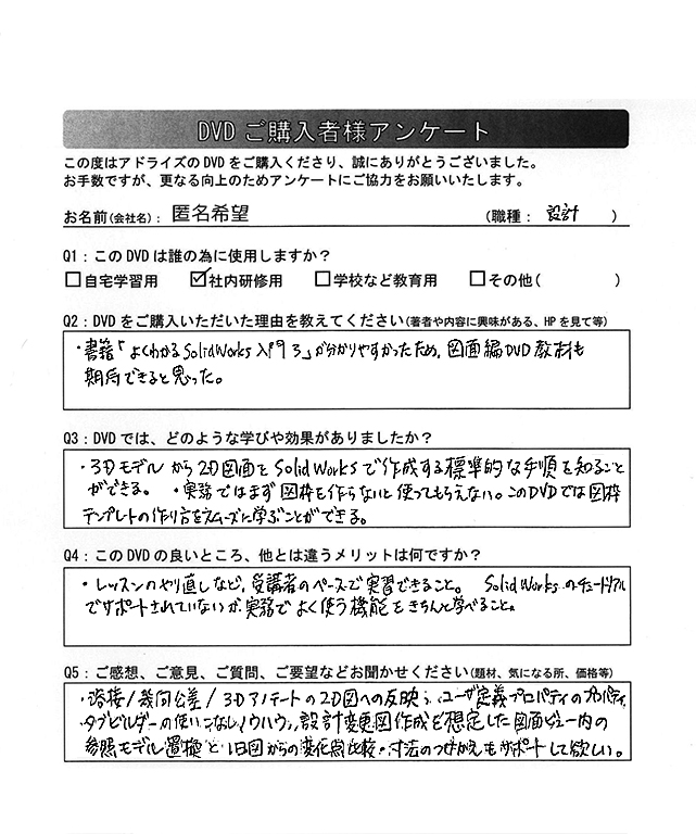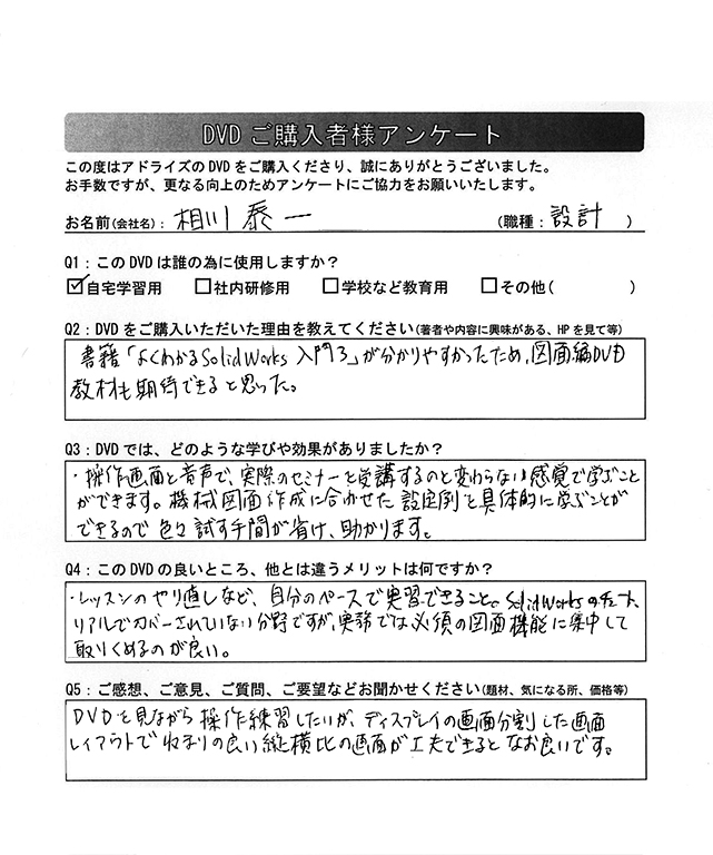 ・書籍「よくわかるSolidWorks入門3」が分かりやすかったため、図面編DVD教材も期待できると思った。