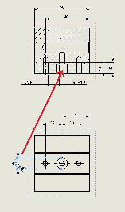 Shiftキーを押しながら寸法を断面図のビューへドラッグします。