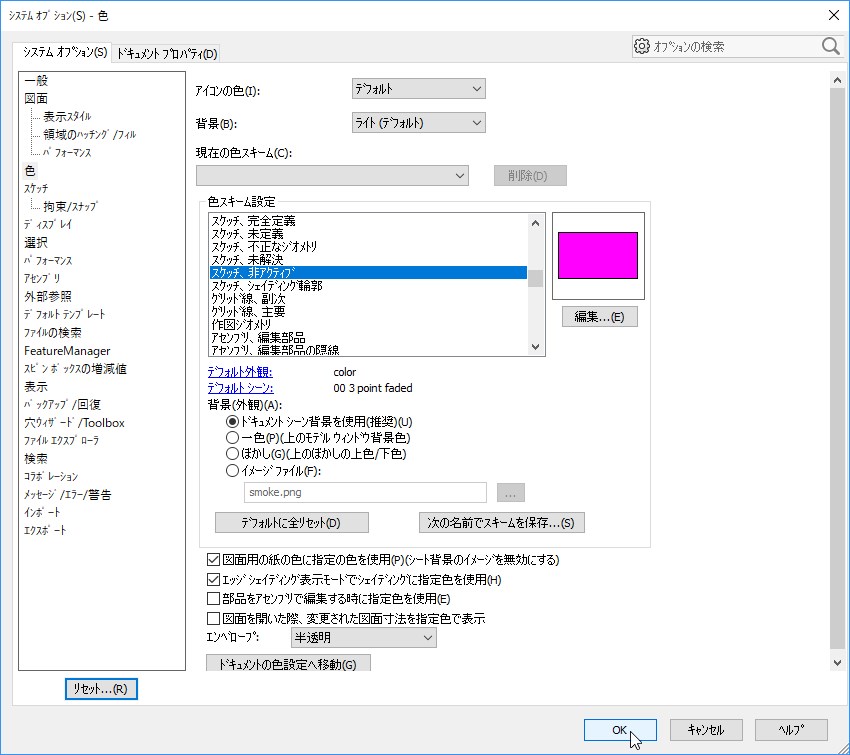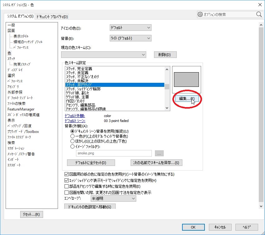 色スキーム設定の項目から「スケッチ、非アクティブ」を選択し、編集ボタンをクリックします。