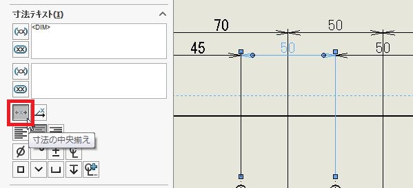 今回も図面ドキュメントで使えるテクニックをご紹介いたします。 ドキュメントプロパティで寸法を中央配置に設定しておくと 自動的に中央に寸法が配置されて便利です。 中央配置設定の場合、補助線や中心線とかぶってしまった時 直線寸法などは下図のように寸法配置のプロパティで中央揃え を外して移動させることができます。しかし、直径(半径)寸法の場合は、寸法配置のプロパティでは グレー表示になっていて中央揃えを外すことができません。