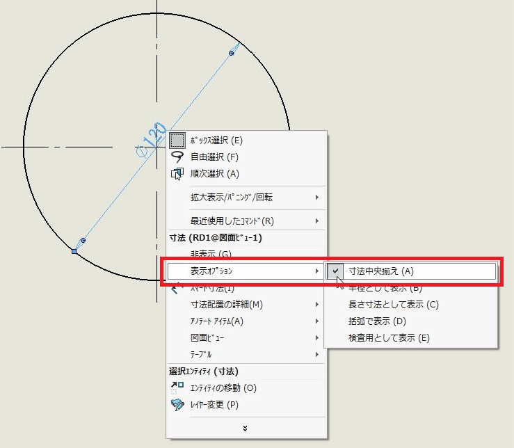 配置を変えたい直径(半径)寸法を右クリックします。 表示オプション → 寸法中央揃え のチェックを外します。これで寸法をドラッグすると、自由に動かすことができます。
