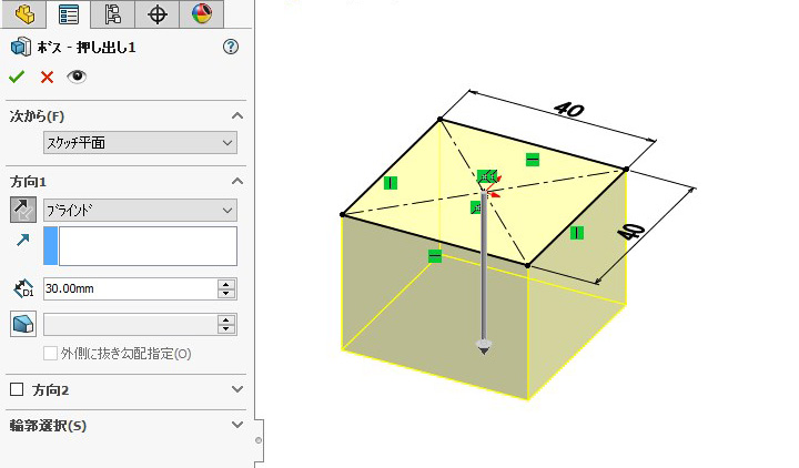 (2) 「押し出し」コマンドで図のように設定し、立体形状にします。