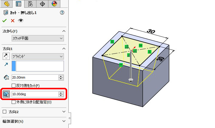 (4) 「押し出しカット」コマンドで図のような設定で内側をくり抜きます。