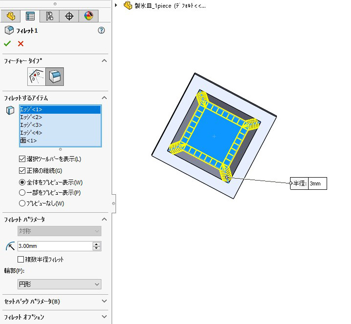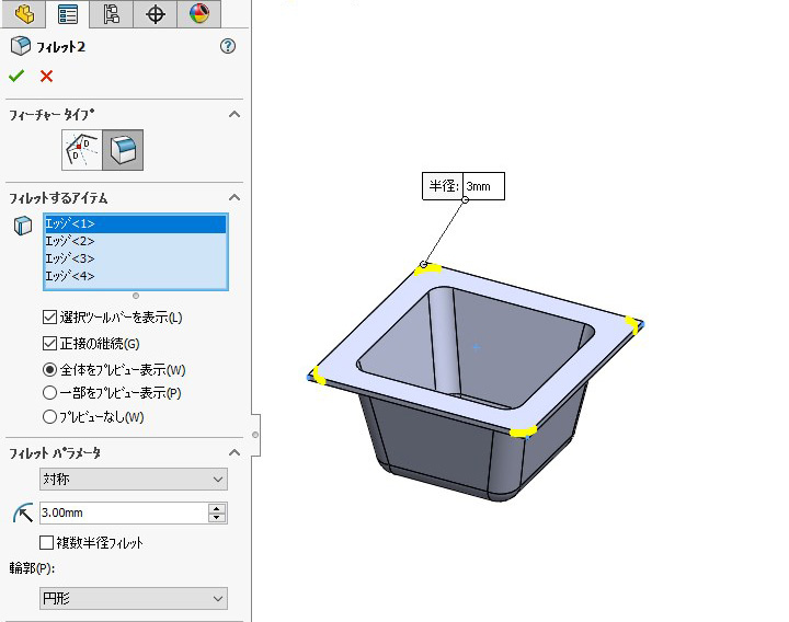 (5) 「フィレット」コマンドで角に丸みをつけます。