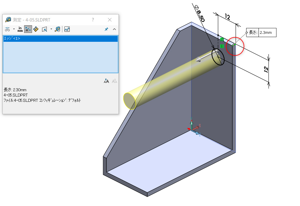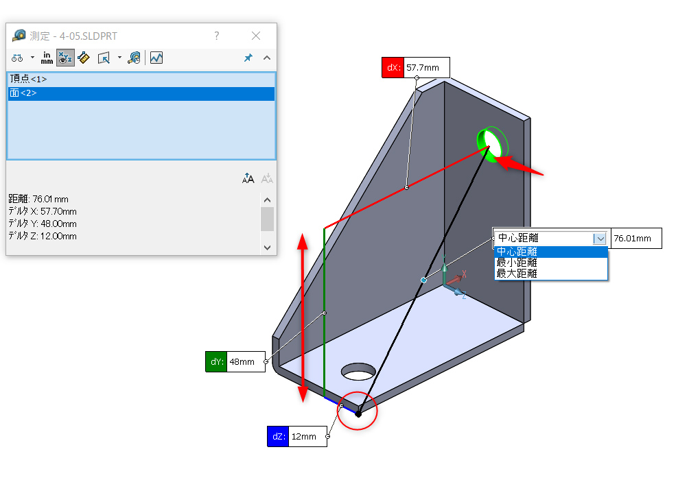 「最小距離」に変えると円筒エッジから点までの最小距離の測定に変わります。