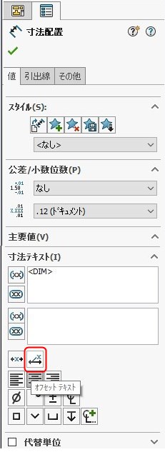 寸法数値が選択状態のまま矢印の丸印を右クリック。