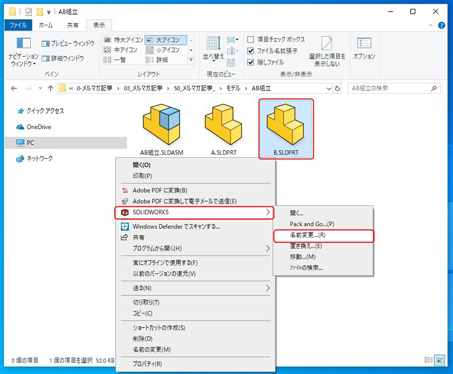 部品ドキュメントの名前を変更する ― Windows Explorerファイルショートカットメニュー