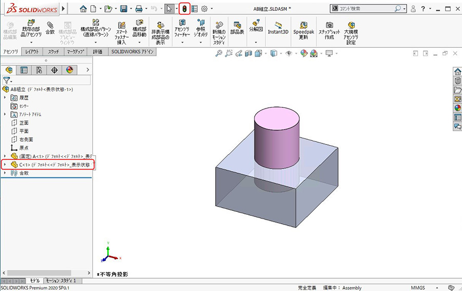 アセンブリドキュメント「AB組立」を開いて確認してみましょう。