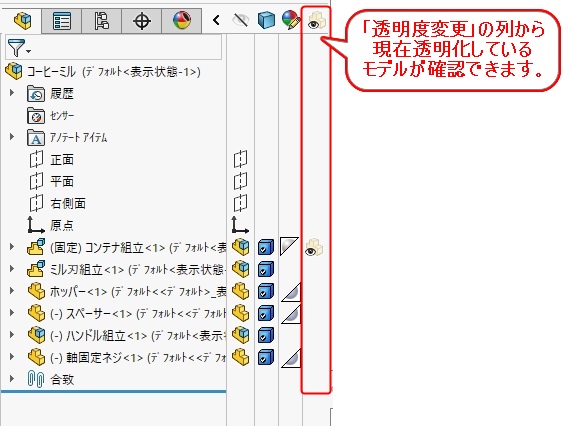 透明化した部品は、「透明度」の列にアイコンが表示されます。