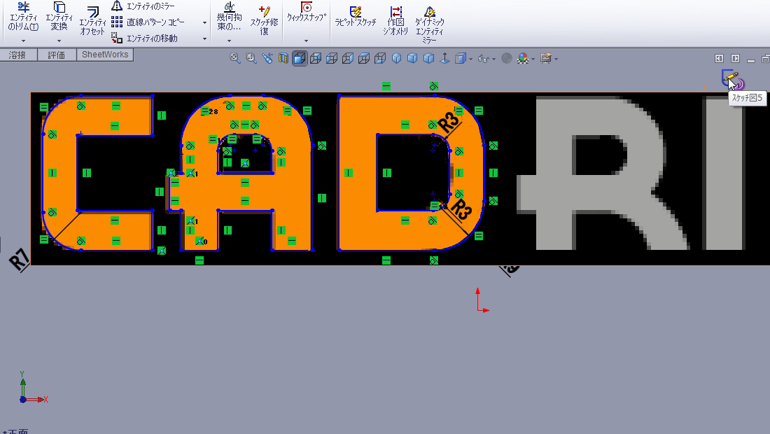 「直線」と「スケッチフィレット」を用い《CAD》をトレースします。