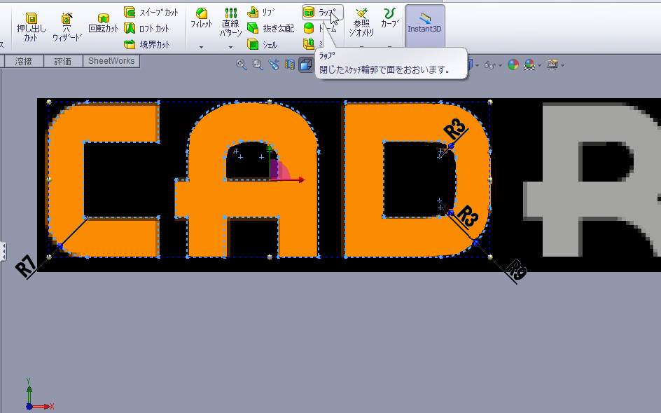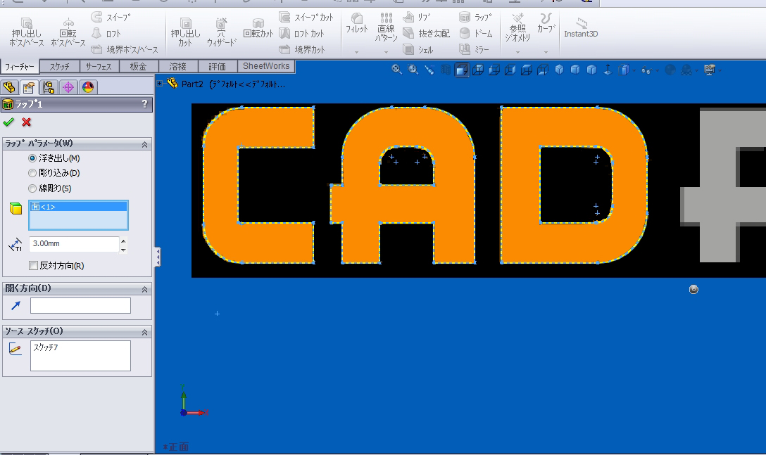 ↑《CAD》をトレースしたスケッチを選択して、「フィーチャー」の「ラップ」をクリック。