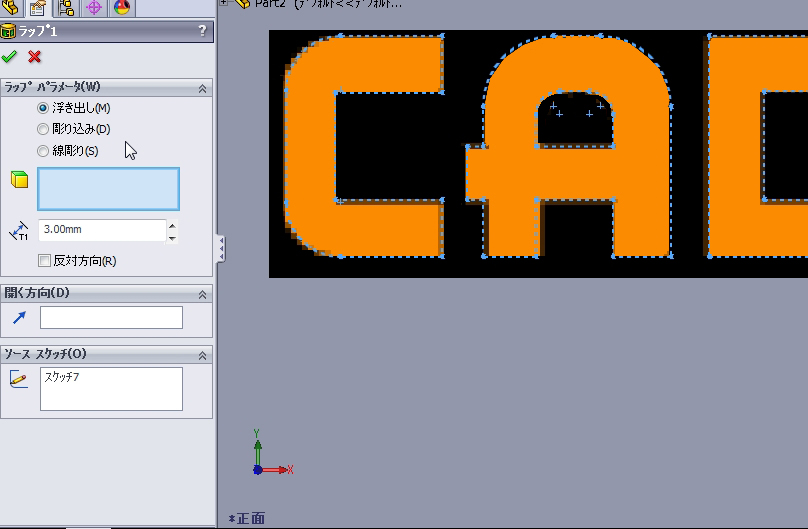 ↑つぎに「浮き出し」する「面」を選択し、ここでは厚さ「3.00mm」で、OKをクリックします。