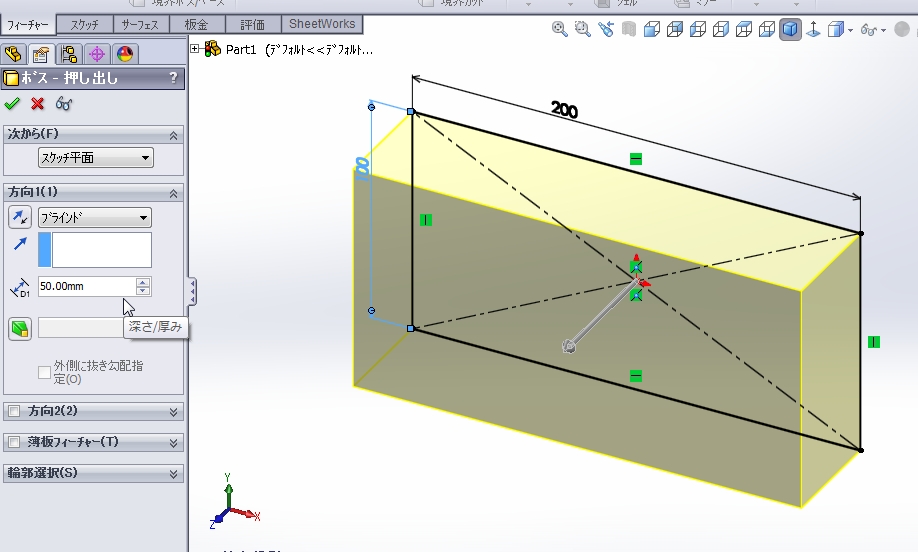 下の図のように矩形を描き、フィーチャーで押し出しをします。