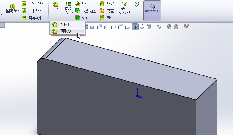 今度はフィーチャーの「フィレット」の▼をクリックして「面取り」を選択します。