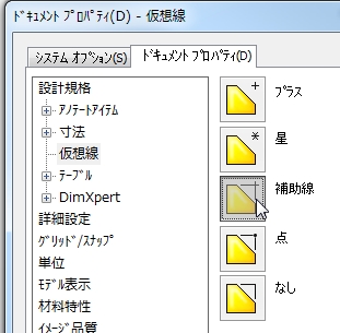 【ツール】→【オプション】→【ドキュメントプロパティ(下図)】→【寸法】→【仮想線】