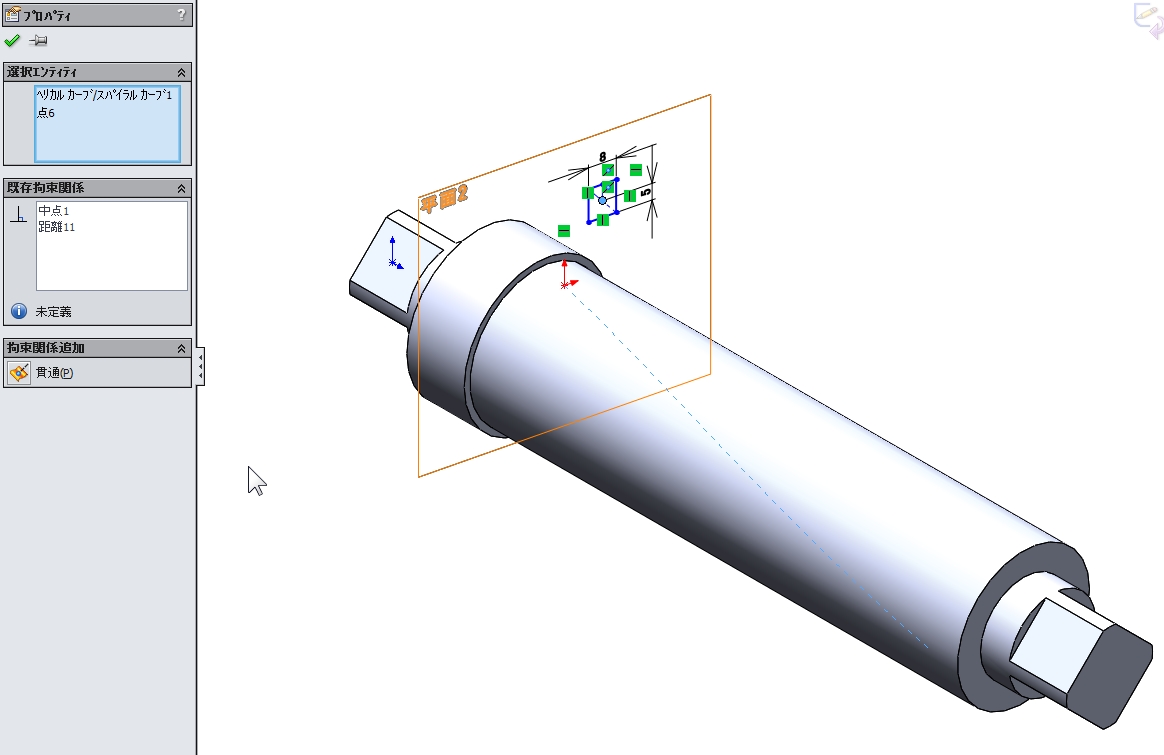 この矩形の中心の点とヘリカルカーブを選択し、『貫通』の拘束をつけます。