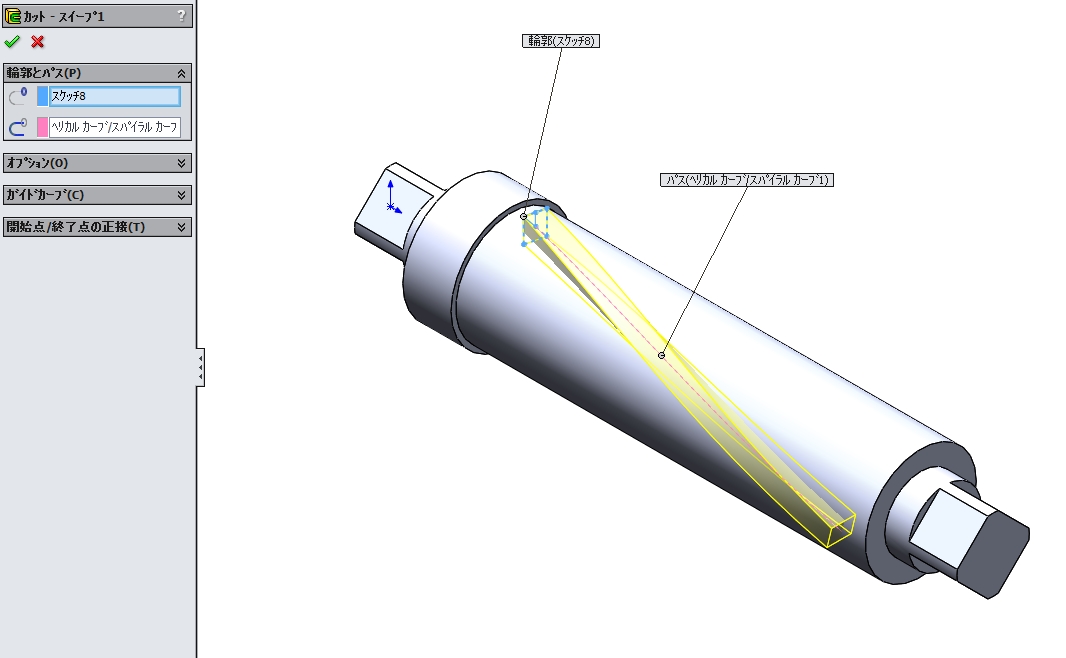このカム軸の溝は「スイープカット」フィーチャーを使用しています。