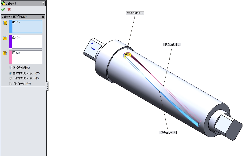 『フィレット』を選択、『ラウンドフィレット』にチェックを入れ、