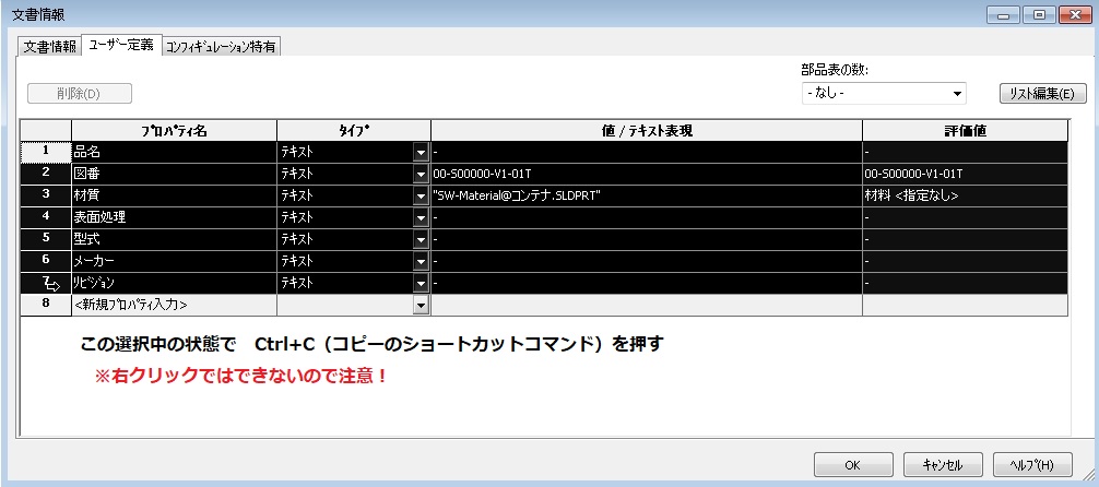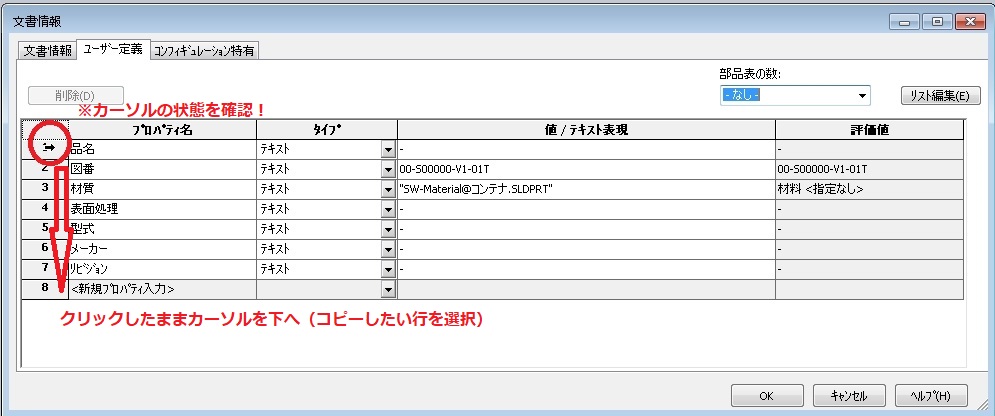 この状態でドラッグすることでプロパティの行を選択することができます。