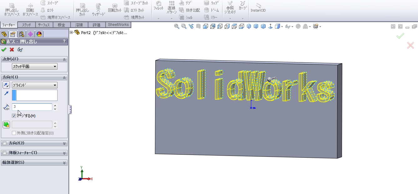 今回は【テキスト その1】について説明します。 「テキスト」コマンドはスケッチで文字を描くことができます。 スケッチで描いた文字を「押し出し」「カット」することができます。 今回は基本の描きかたをしま […]