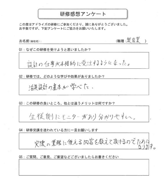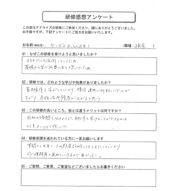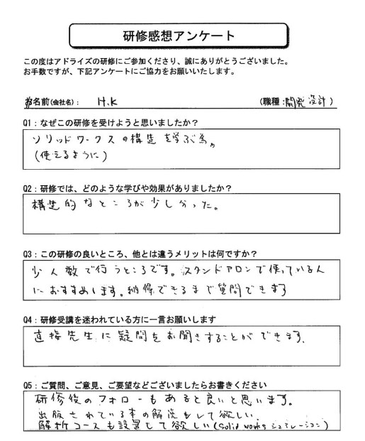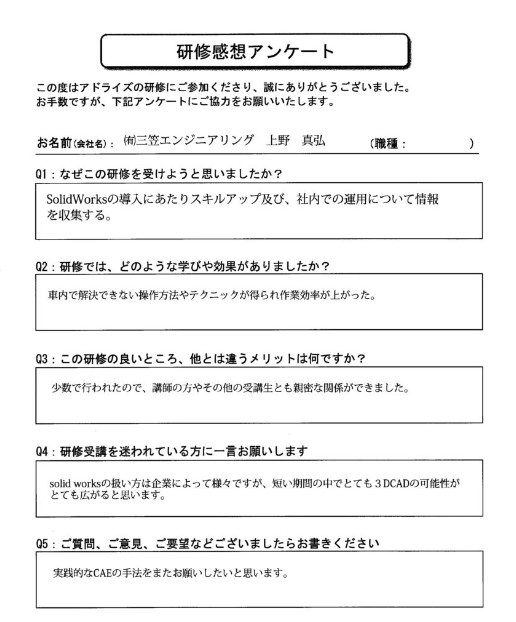 研修後のフォローもあると良いと思います。出版されている本の解説もして欲しい。解析コースも設置して欲しい(SOLIDWORKSシミュレーション)